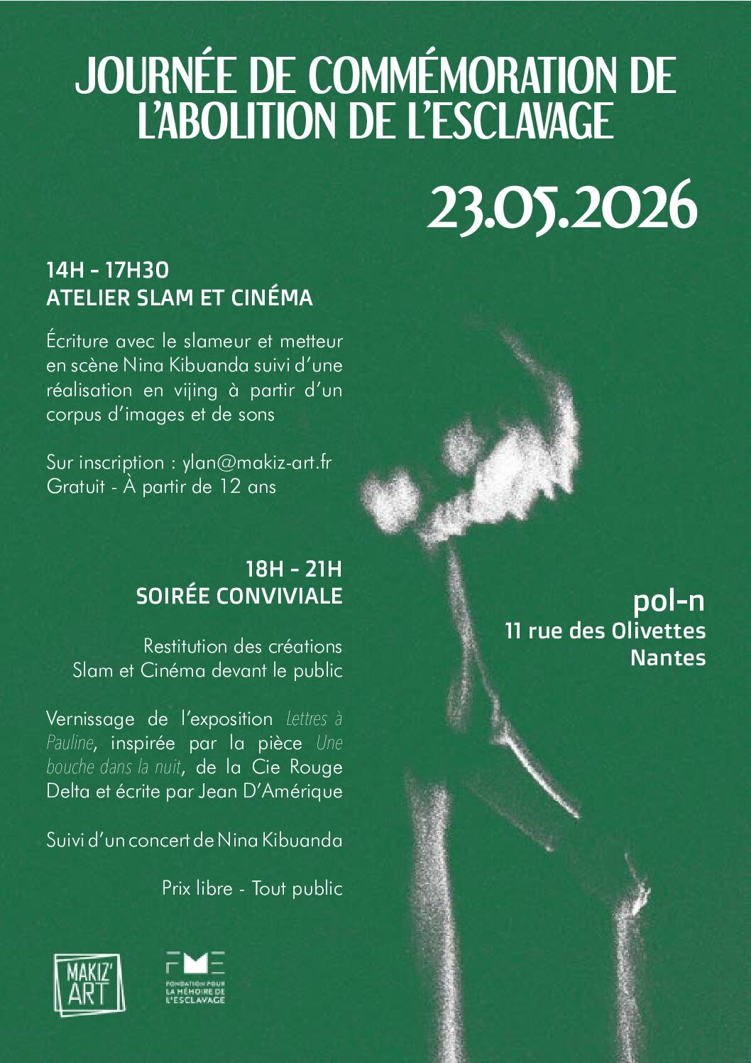 – 14h-17h30 : Atelier Slam & Cinéma accompagné par le slameur Nina Kibuanda. À partir de 12 ans, gratuit et sur inscription : ylan@makiz-art.fr