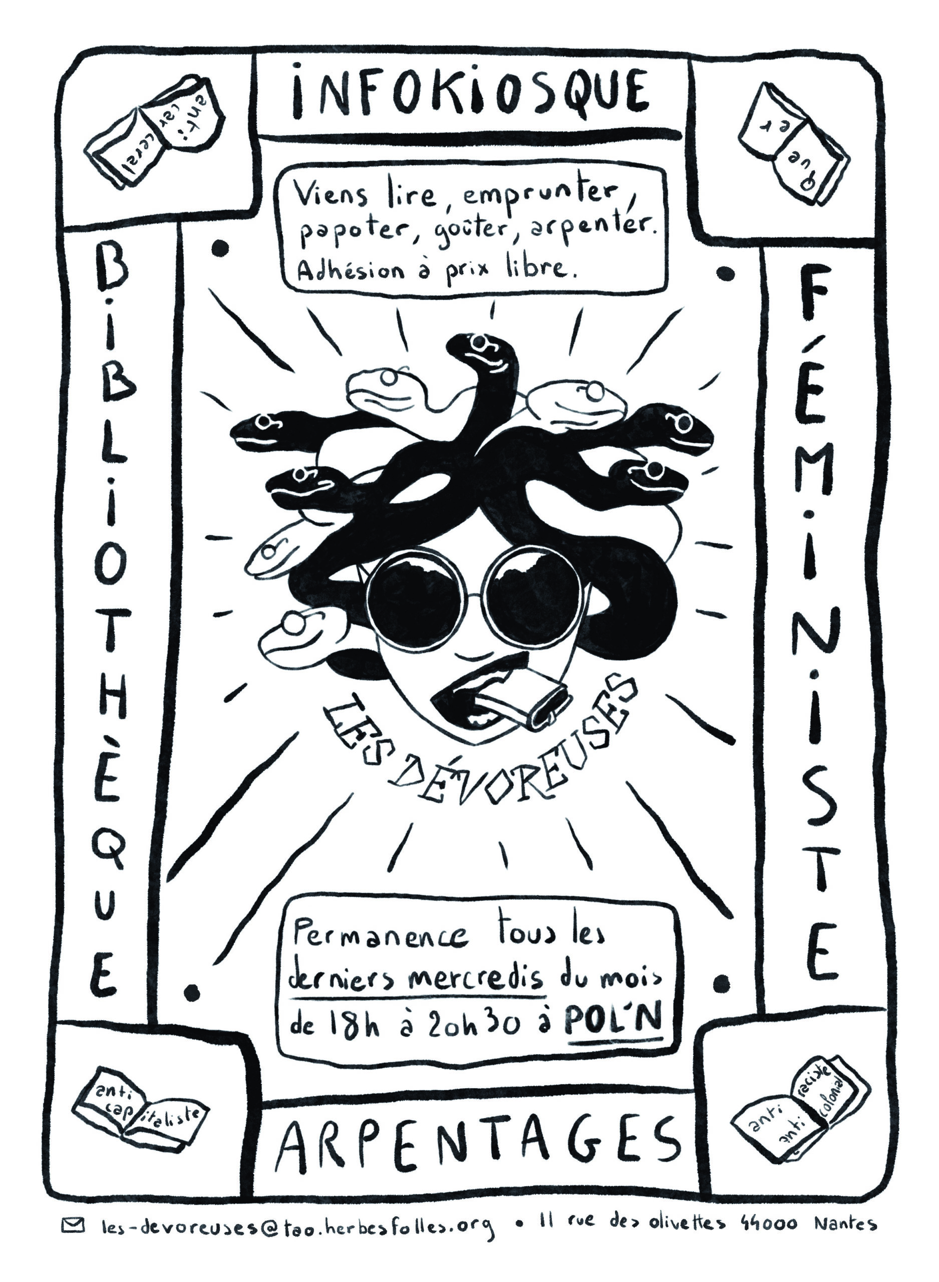 Les dévoreuses proposent chaque mois des livres à l’emprunt et en dépôt-vente, des revues à prix libre ainsi que leur fameux infokiosque !